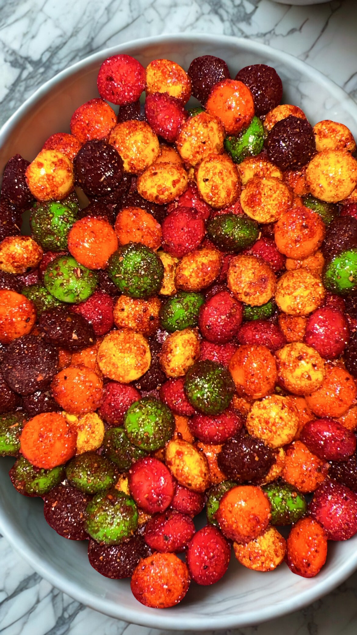 Skittles covered in homemade chamoy and chili powder