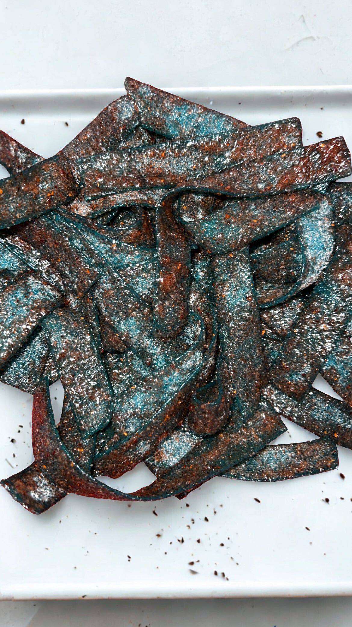 Blue raspberry flavor sour belts covered in homemade chamoy and chili powder